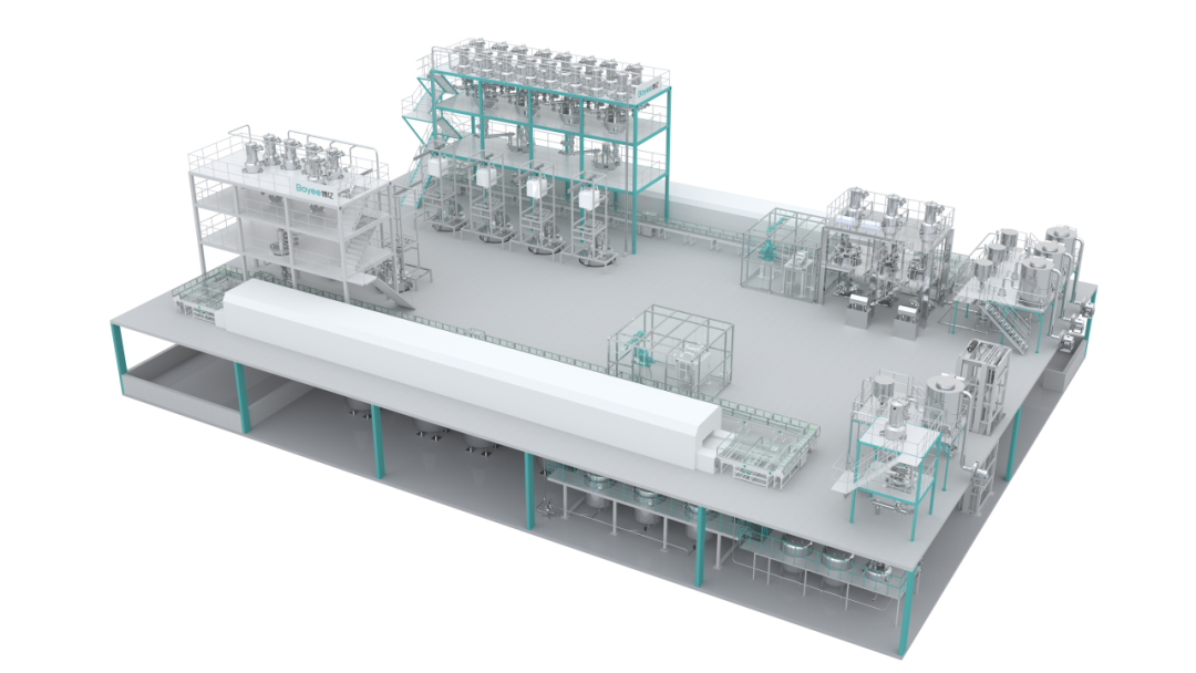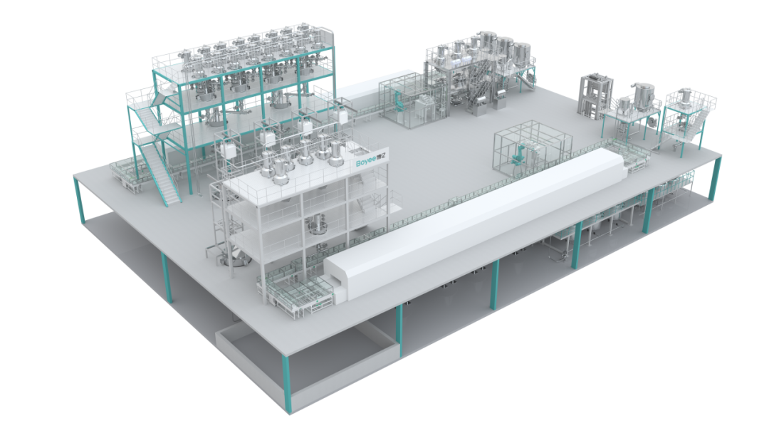 博亿固态电解质材料的生产工艺流程包括吨袋投料、计量下料、配料混合、摇匀烧结、粉碎、干燥、冷却、混合乳化、研磨系统、除磁/过滤、自动罐装等关键步骤。
